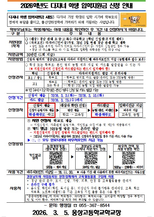 2026학년도 다자녀 학생 입학준비물품 구입비 지원 사업 안내